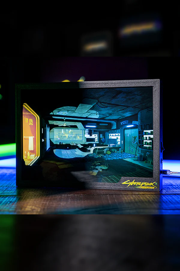 The Cyberpunk: Edgerunners David’s Apartment Shadowbox makes clever use of light and layers. At first glance it’s a straightforward piece of environment art — but when you switch it on, watch the mood change as light hits the floor and ceiling. In a dark room, this illuminating effect is amplified even more, with the black-out plate creating sharp shadows. If you turn the light sensor on, the shadowbox will light up automatically in dark surroundings, changing the mood of the scene in real time.