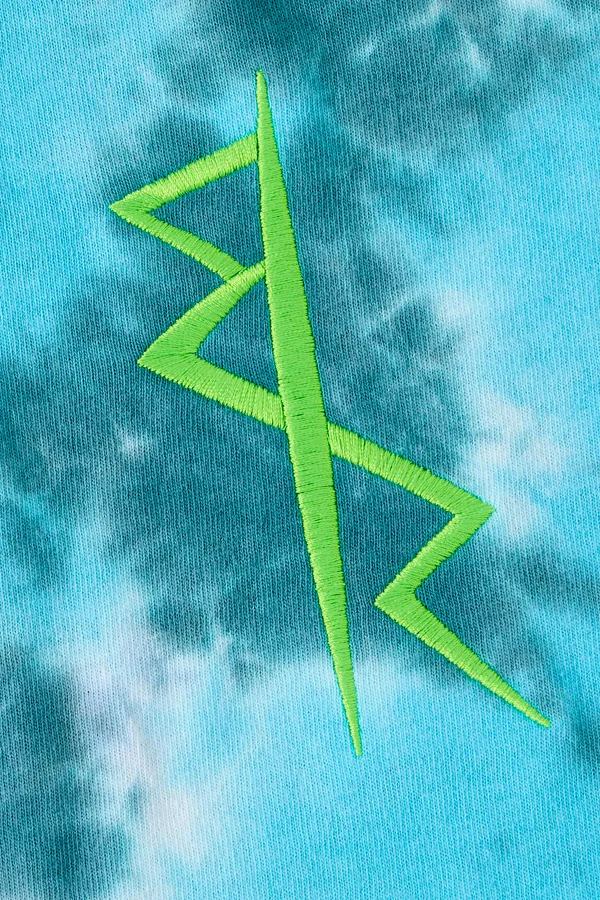 This t-shirt showcases a high-stakes battle between two Night City legends whose limits are pushed all the way to the edge. Its saturated tie-dye colors are complemented by the Edgerunners insignia embroidered in eye-catching cybergreen on the front.