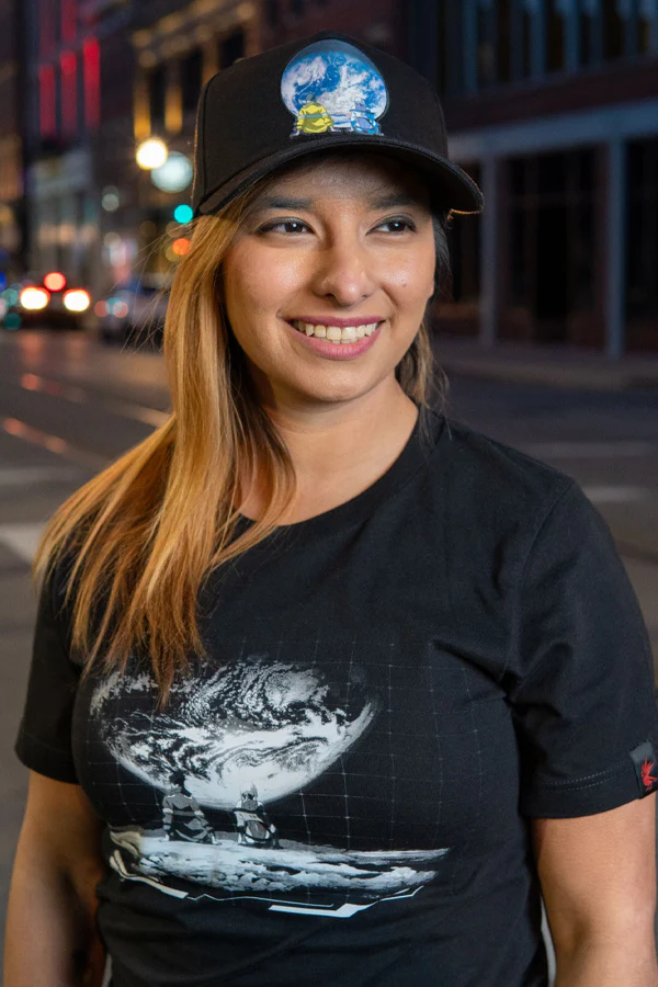 This unisex tee captures their intimate lunar encounter with a mesmerizing front print. The Earth looms large in the sky, its neon-lit cities casting an iridescent glow upon the moon's barren terrain. Lucy and David, silhouetted against this radiant backdrop, embody the very essence of connection amidst isolation, a testament to love's resilience in the face of solitude.