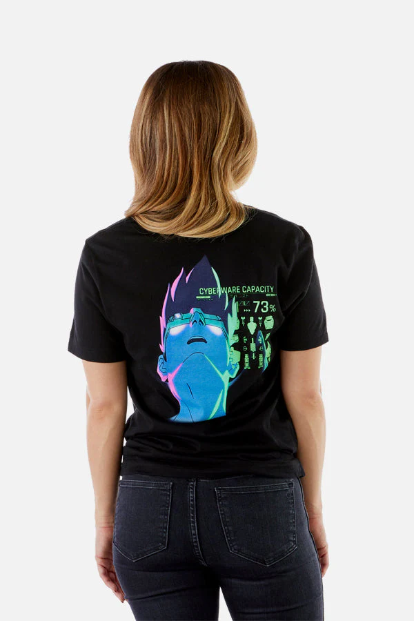 Inspired by the award-winning Cyberpunk: Edgerunners anime series created in partnership with the legendary Studio Trigger, this tee features the iconic Edgerunners symbol on the front, along with a vibrant portrait of protagonist David Martinez on the back. The design is full of neon colors and showcases David's obsession with chrome and the cyberpunk way of life.