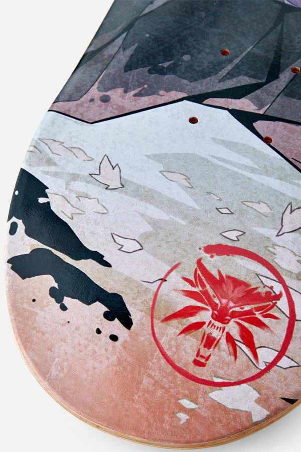 This eye-catching board features a red top veneer and an illustration of Geralt battling a dangerous yokai. With one hand deftly casting Igni while the other slices with a silver sword, this deck’s art perfectly embodies the art style and spirit of The Witcher: Ronin manga.