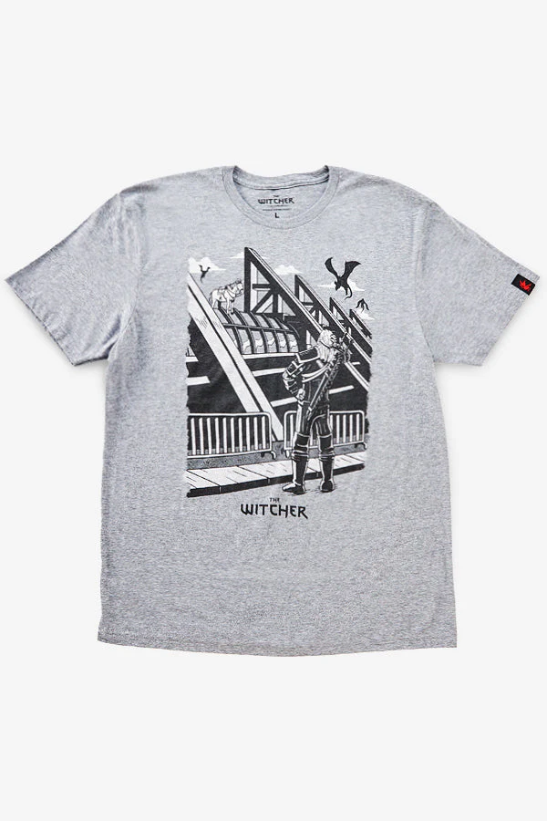 Saddle up and join the legendary duo with our The Witcher San Diego Roof Roach Tee! This remarkable tee showcases Geralt and his trusty companion, Roach, in a hilariously unexpected situation outside the San Diego Convention Center.